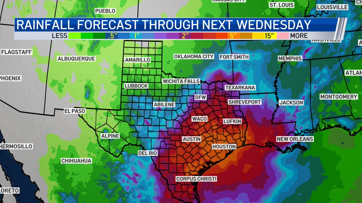 This is the seven day rain potential. The heaviest will fall in East and South Texas, and the majority of these amounts will take place Friday through Monday. Latest forecast at http://nbcdfw.com/weather
