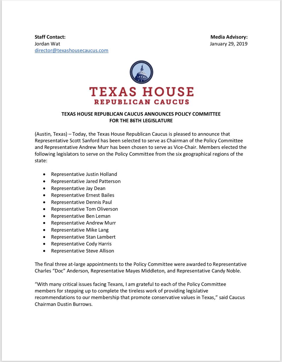 It is an honor and a privilege to be able to work with the members of the House Republican Caucus, and I am grateful to the Executive Committee for appointing me to serve as the Chair of the Policy Committee. #txlegepic.twitter.com/6FLncPylxE