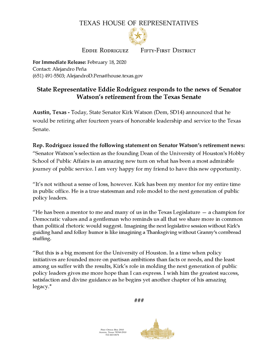 Senator @KirkPWatson’s selection as the founding Dean of the University of Houston's Hobby School of Public Affairs is an amazing new turn on what has been a most admirable journey of public service. I am very happy for my friend to have this new opportunity. #txlege (1/2)pic.twitter.com/93MKoWwu5v
