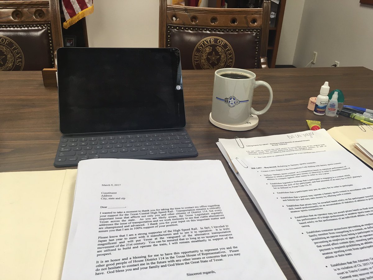 Starting my day with a hot cup a joe, a stack of correspondence and heart bursting with thankfulness for another day in Texas! #TxLege.pic.twitter.com/VaQIjcy2W9