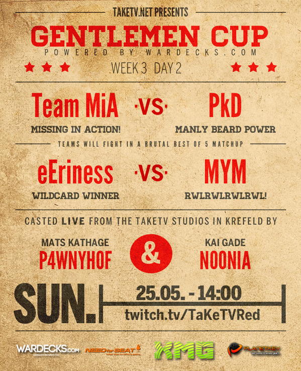 More #GentlemenCup 14:00 CEST - @Team__MiA vs @PlanetKey then eEriness vs. @myMYMcom - http://www.twitch.tv/taketvred pic.twitter.com/ksgA4LizaC