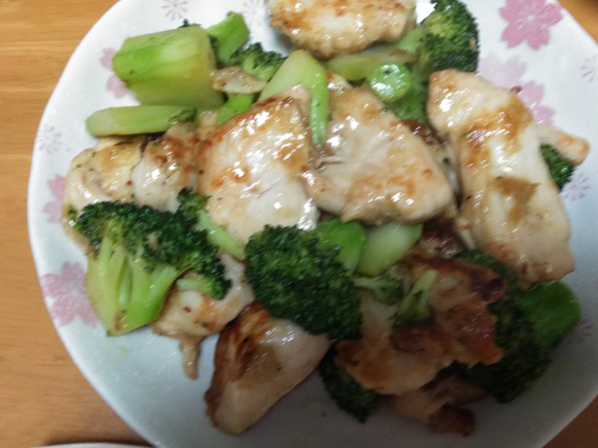予めブロッコリーは茹で、鶏むねをタレ(酒、醤油、塩、胡椒、にんにく、生姜、片栗粉)に漬けてから炒める