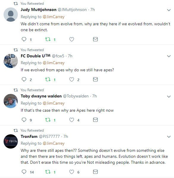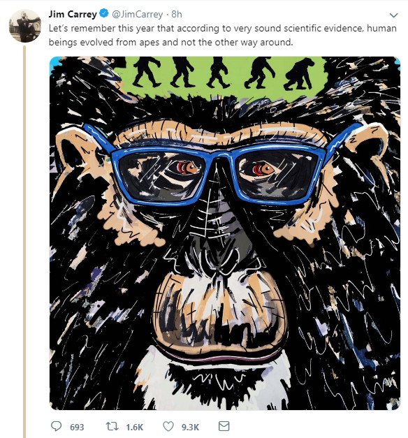 @JimCarrey has NO mind. He is about as intelligent and relevant as@Alyssa_Milano and@Rosie. Even though evolution is a lie, they still sit around scratching their butts and then sniffing their finger. At least monkeys know right from wrong.
