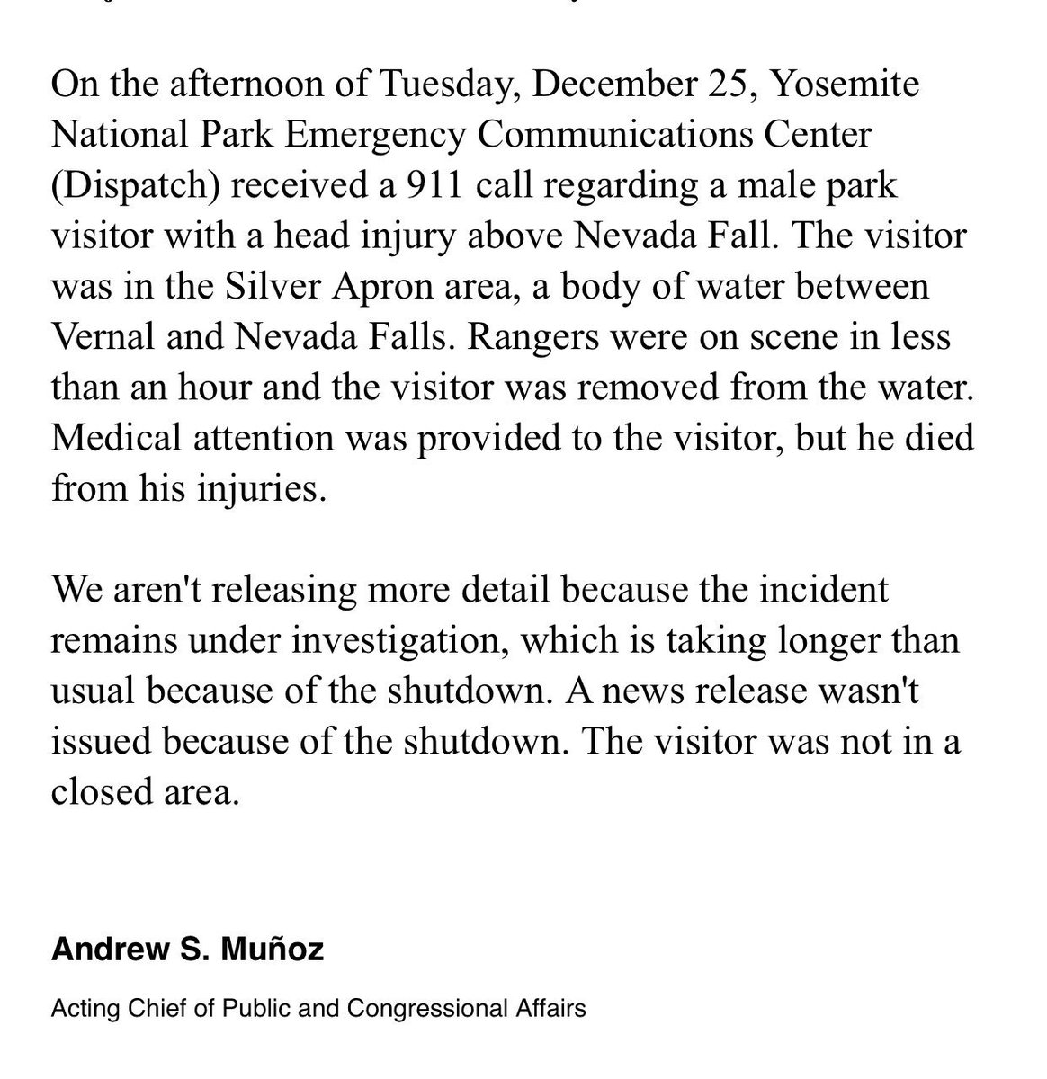 A visitor died after falling in Yosemite on Christmas Day, during the government shutdown.pic.twitter.com/xo33XoD5wQ