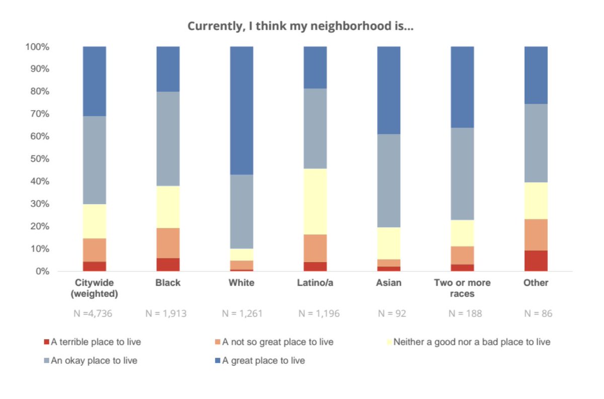 "White respondents were almost three times as likely to say their neighborhood is a 'great' place to live, compared with black and Latino respondents." one of many results from the