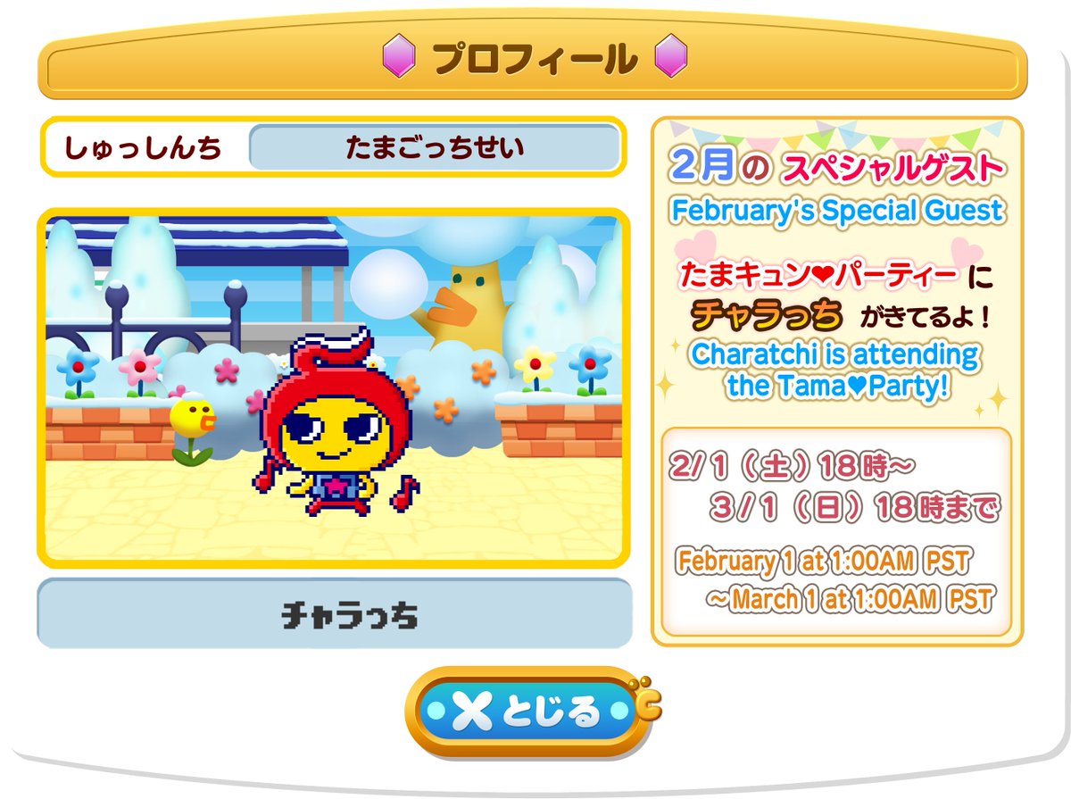 Charatchi is February's special guest on the Tamagotchi On APP! You can find him at the Park and the Tama
