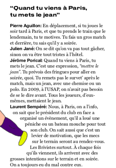 "Pour effectuer l'arrêt de volée, il fallait crier 'marque' et planter le talon. Le mec qui invente cette règle, c'est un pervers polymorphe". Jean-Paul Dubois, ancien arrière et prix Goncourt dans