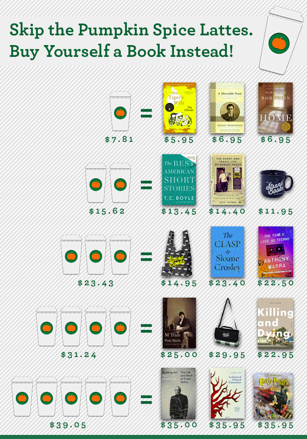 Emily Wilson @chowmeyowLove this chart by@strandbookstore of books & bookish things you can buy instead of PSLs. pic.twitter.com/oCAQgFOTok1 retweet 0 favorites -