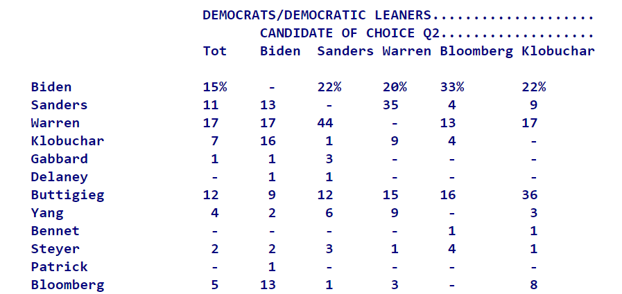Quinnipiac has a chart of second-choices: https://poll.qu.edu/national/release-detail?ReleaseID=3654 … clearest 3 tranfers remain: Sanders --> Warren Warren --> Sanders Bloomberg --> Biden [so, about Bloomberg reportedly entering to stymie Sanders...]pic.twitter.com/Pr3wazcpmU