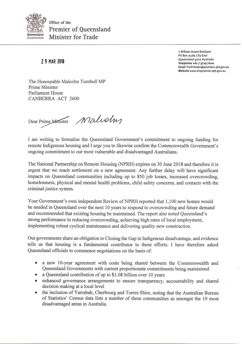 @TurnbullMalcolm telling him Qld will contribute $1.08 billion towards a new 10 year remote indigenous housing partnership. The PM must now stop the politics and stump up his share#DontWalkAway#CloseTheGap@MickdeBrennipic.twitter.com/Sznm50xjTn