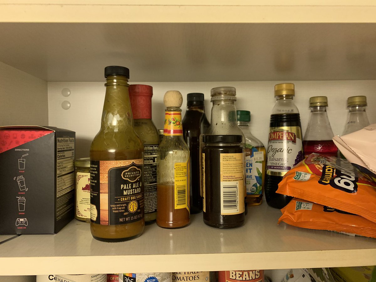He has at least 15-20 unused bottles of condiments and sauces taking up several shelves in my fridge and pantry.