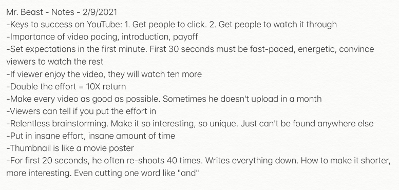 My notes from @MrBeastYT 's Clubhouse talkpic.twitter.com/qewTZu7EGj