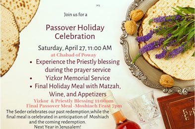 #Poway synagogue’s website,#Passover Holiday Celebration (pic) had been planned to be underway (11a PT) at time of shooting incident cited by sheriff’s office (“just before” 11:30a PT): https://www.chabadpoway.com/ pic.twitter.com/PBRNj5UCM6