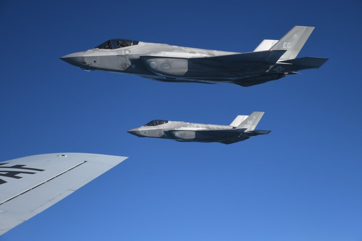 F-35A Lightning II jets assigned to the 33rd Fighter Wing from @TeamEglin Air Force Base, Florida, receive fuel from a KC-135R Stratotanker during Exercise Savannah Shift, Savannah, Georgia.#ReadyAF