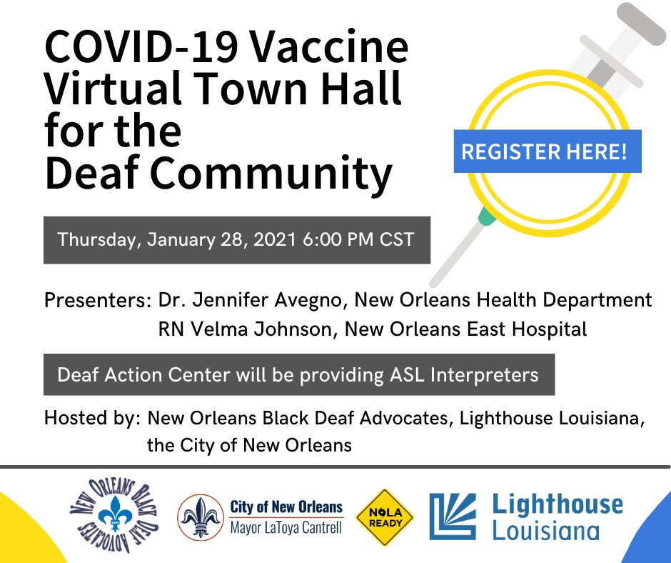 #CovidVaccine? Join our for a Virtual Town Hall Forum for the Deaf Community hosted by Lighthouse Louisiana and New Orleans Black Deaf Advocates! ASL interpretation provided. Register at https://rb.gy/eswgp9 pic.twitter.com/cYv2HRmAzP