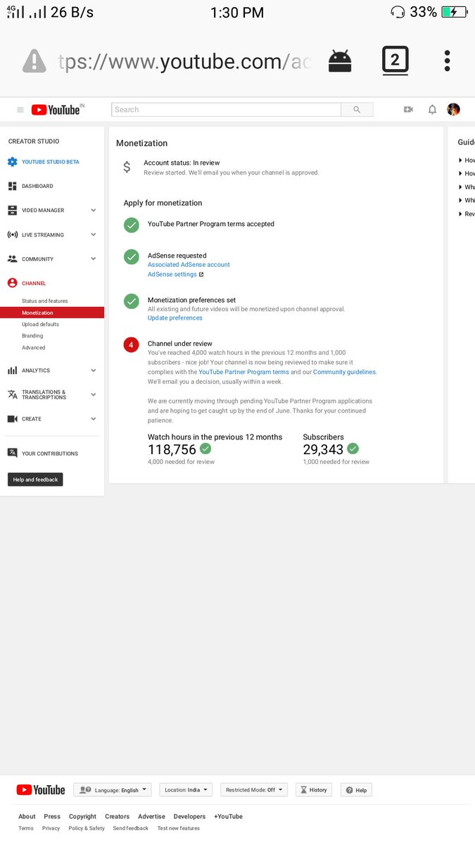 @TeamYouTube Dear youtube team, My channel is completed the 1lac hours watch time and 29k subscriber in previous years But still time my channel monetization disabled so please guide us. My channel link: https://www.youtube.com/channel/UCXi3iotkufy0DtQV8qoq5LQ … E mail. Makwanadilip167@gmail.com Thank you.pic.twitter.com/oHMPz6qrQt
