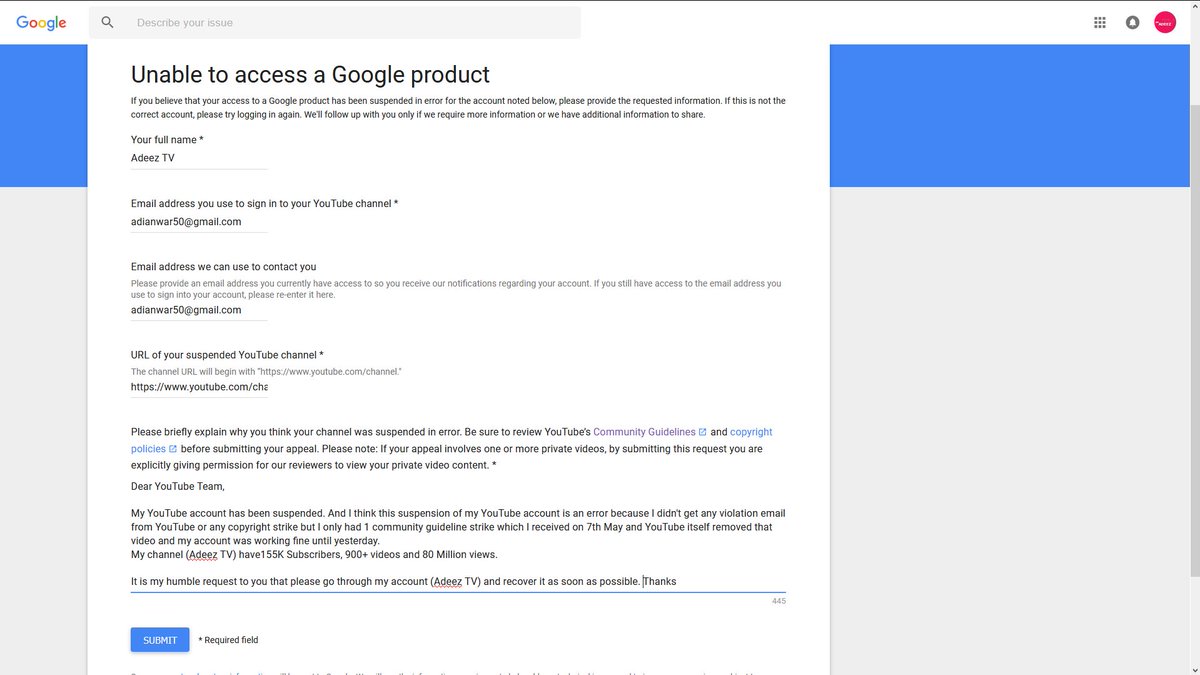 @TeamYouTube My YouTube Account has been suspended and I'm completely banned from YouTube which i don't know why. My Channel Adeez TV has 155k Subscribers, 80 Million views on it.