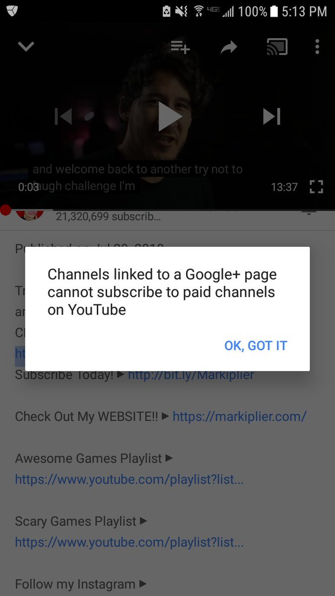 So it looks like i cant become a sponsor for @markiplier due to the fact that my 4 year old YT channel is connected to google + and i would basically have to make a new one. @TeamYouTube @Google help please? I want to sponsor people but cant cuz of this bullpic.twitter.com/wKFGuzJho9