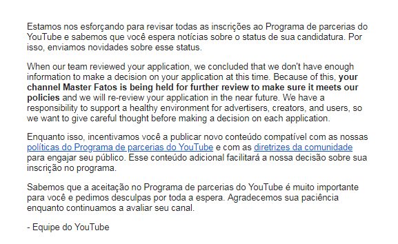 @YouTubeBrasil estou a 8 meses com requisito batidos e canal em análise... tenho gente conhecida que posta vídeo Kibado de TV, bateu os requisitos e em 3 dias foi monetizado... que injustiça é essa com meu canal? 8 meses!!!