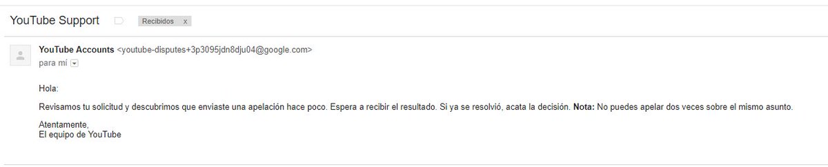 @TeamYouTube yo apele a mi suspencion y me llego el mismo correo de suspencion, no me llego uno de "respuesta de apelación" ni nada que diera a entender una respuesta, ni llego ningun correo al correo que puse que respondan, tengo que tomarlo como definitivo o no contestaron aun?pic.twitter.com/0yWccYUQH4