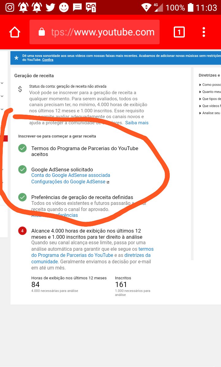 Bom dia. Como podemos perceber no print screen que você enviou, você tem 161 inscritos e 84 horas de exibição. Os novos requisitos de qualificação para o Programa de parcerias do YouTube são 1000 inscritos e 4.000 horas de exibição nos últimos 12 meses: http://goo.gl/L1m9ZG
