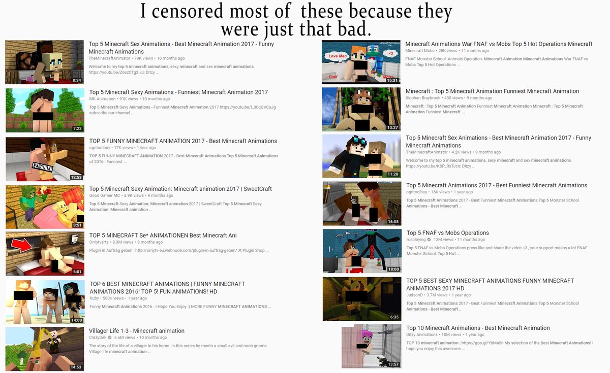 How do you report thumbnails? There are a lot of lude minecraft thumbnails if you were to search "minecraft animations". I tweeted about it many months ago, here are some examples.https://twitter.com/setosorcerer/status/997229110790377472 …