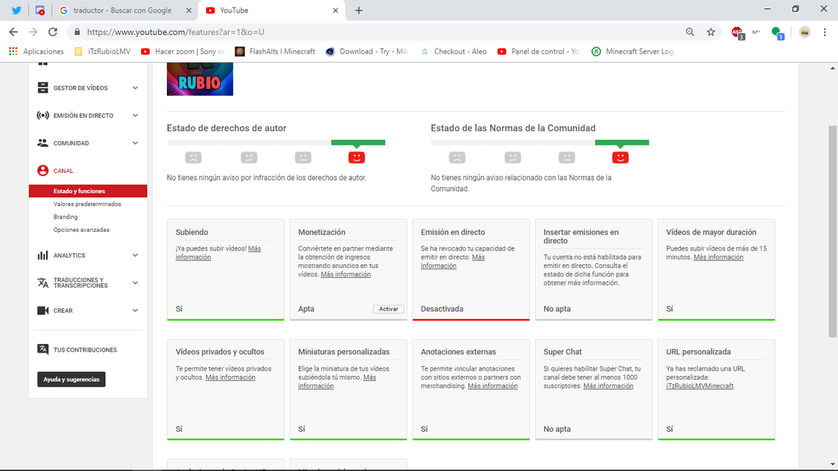 Hola. ¿Podrías enviarnos una captura de pantalla de la pestaña de Estado y funciones de tu canal? Ten en cuenta que si el bloqueo se produjo en el mes de julio como nos comentas, todavía no se habría completado el periodo de 90 días. Quedamos atentos a la imagen.
