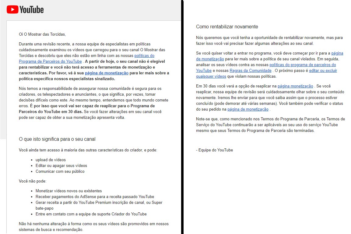 @TeamYouTube tirou a monetização de TODOS os vídeos do nosso canal, mesmo estando dentro das normas de direitos autoriais e com permissão de vários proprietários para usar parte das imagens nos compilados que fazemos. Essa pouca receita que tínhamos que deixava nosso site no ar.pic.twitter.com/0DmHatWfz7
