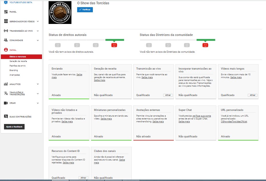 Olá. Poderia nos enviar um print screen completo da aba "Status e recursos" e do "Gerenciador de vídeos" do seu canal? Aguardamos aqui!