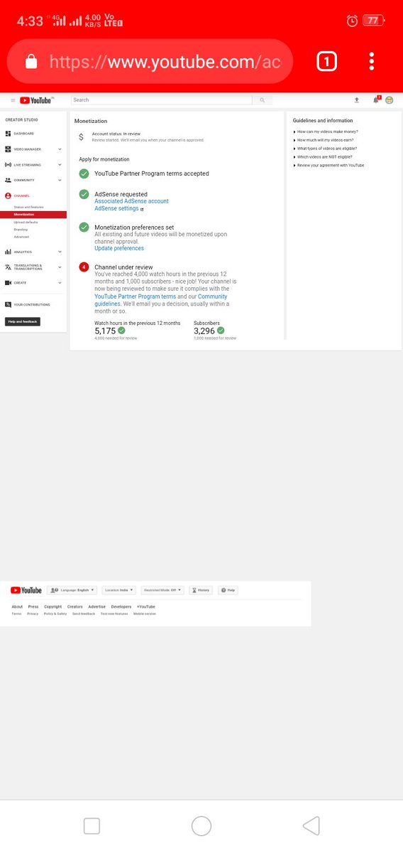 Hello @TeamYouTube my channel is completed the 4k + hours watch time and 3k + subscribers in privious 15 days and still my channel monetization is not enabled please guide us.