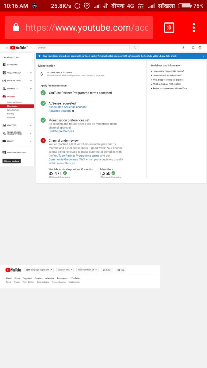 Hello @TeamYouTube My channel is completed the 4K+ hours watch time & 1K+ subscribers in previous 365 days and still my channel monetization is not enabled plz guide us. Channel link: -https://www.youtube.com/c/sankhalamusicandfilms/ …pic.twitter.com/NtHrZcnrVi
