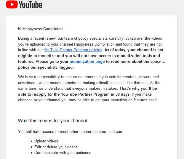 HELP ! @YTCreators @TeamYouTube I was receive email on September 27, that my entire channel demonetized. I Have no strike in copyright n community Guidelines an the Reason was " Duplication". I have reaching youtube partner operation and I not meet my Expectation. Help mepic.twitter.com/M0wex2GygT