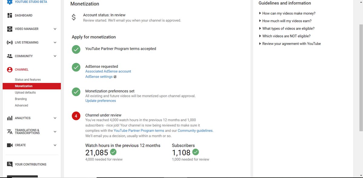 @TeamYouTube I've waited for month and a half after reaching 1k subs/4k hour watch time, but I still haven't received an email in regards to YouTube Monetization. Please review My Channel: https://www.youtube.com/channel/UCS5kn28t-DE0yC2GeFoFNpg?view_as=subscriber …pic.twitter.com/MVbduHg8B3