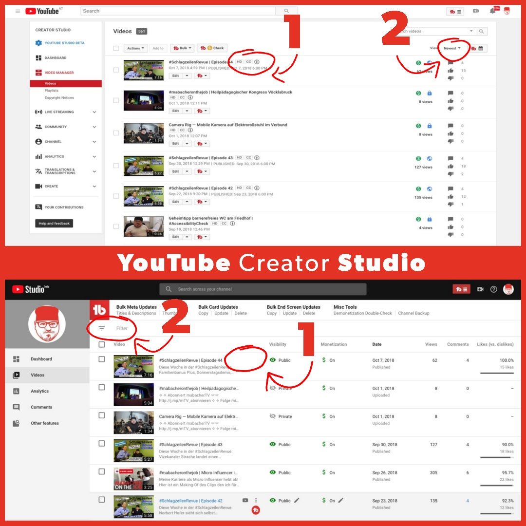 To @YTCreators The old Creator Studio: 1 = seeing if I have already added CC --> top! 2 = easy filtering 8 (!) options! The new Creator Studio: 1 = no easy information on CC status! 2 = only 3 filter options | NO monetized status filter!!n That's just a quick 1. Impression.pic.twitter.com/jcyK7BUCqD