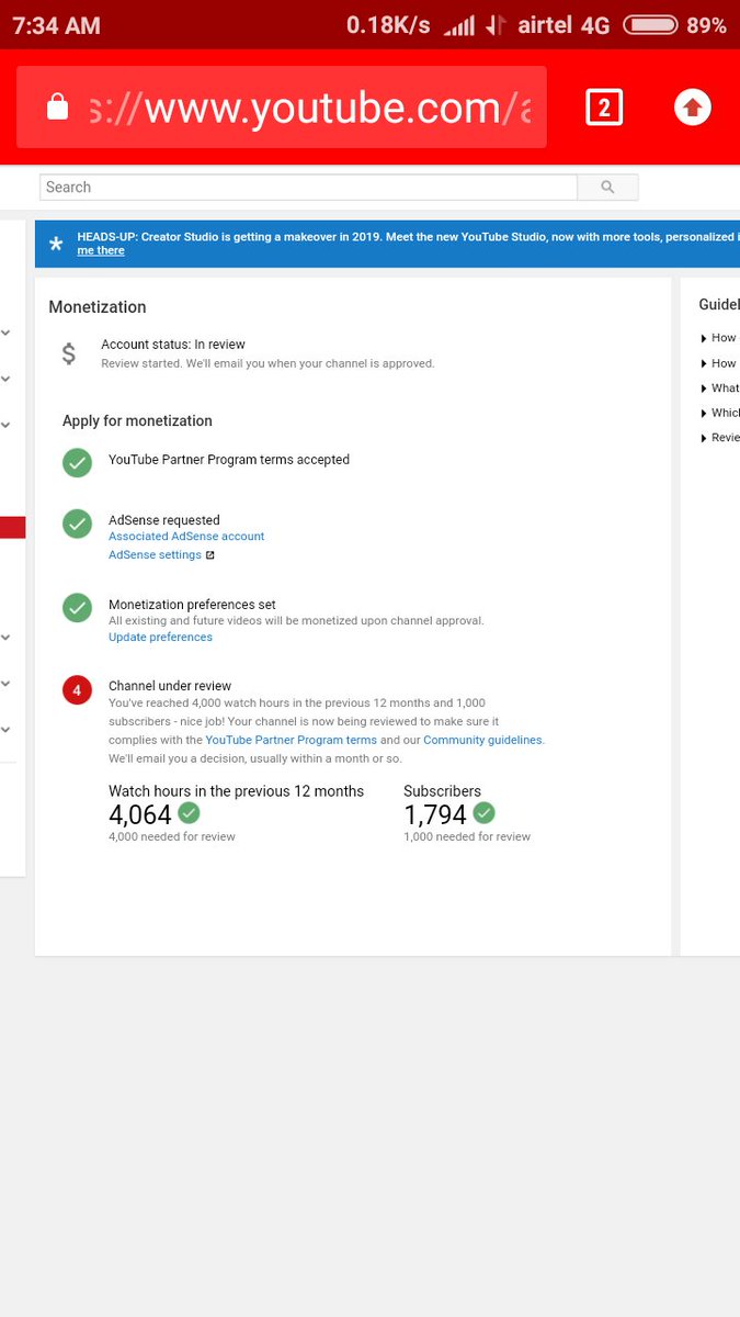 @TeamYouTube here is screenshot that you ask from me...I have completed 1k subscribers and 4k hours .Still monetization is not enabled please guide us . Thank you Channel link https://www.youtube.com/channel/UCPKL0LpP2PJG_S2ygtpXBGQ …pic.twitter.com/XjsawQCpdJ