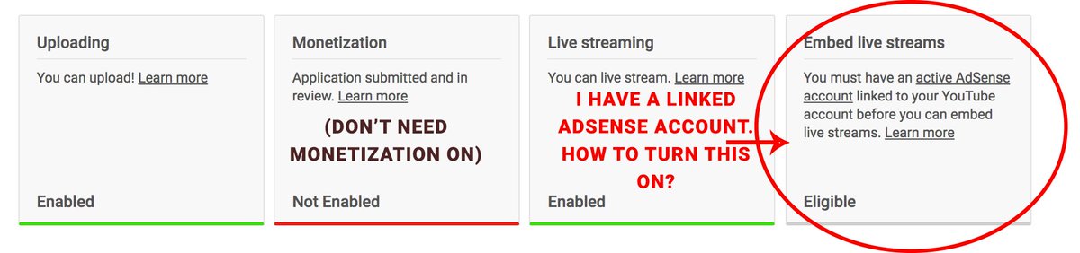 @TeamYouTube thank you for response, but perhaps I am not being clear. I have agreed to the Partner Program terms. I have an active Adsense account that is associated to the channel. But, I do not have the option to enable embed live stream. What am I missing?pic.twitter.com/PaJKW0unyw