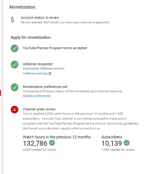 Hello @TeamYouTube My channel is completed the 4K+ hours watch time & 1K+ subscribers in previous 12 Months and still my channel monetization is not enabled plz guide us. Channel link:- https://www.youtube.com/channel/UCOqI0C03WLfENKwD7yUSmGA …pic.twitter.com/lebCz4qwWD