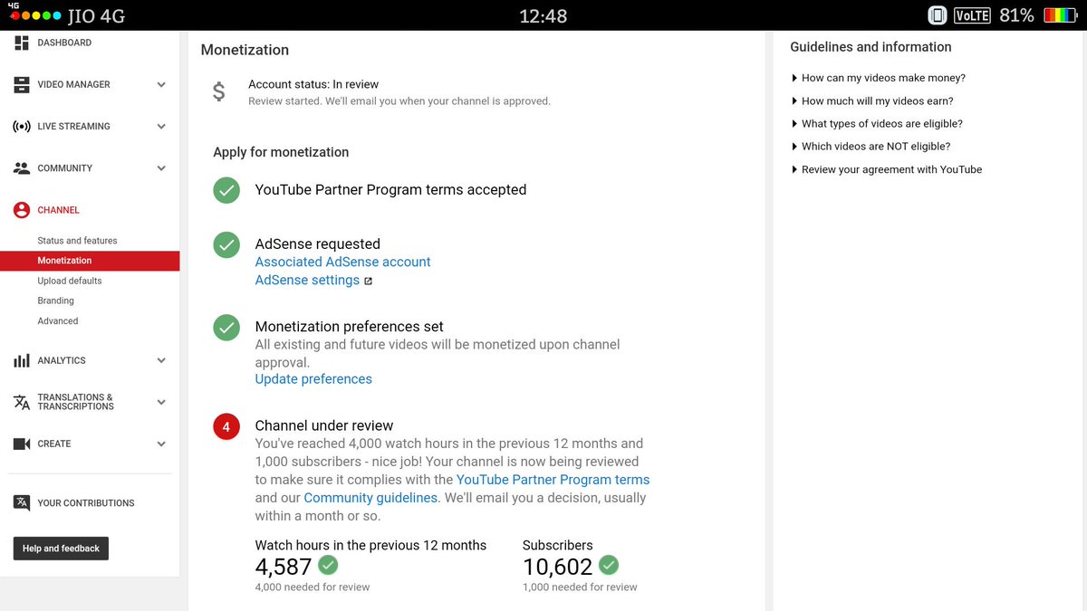 @TeamYouTube Dear Team YouTube I have already completed 4k hour And 1k Subscriber Inlprevious 365 Days and my channel is under review till One month.but monetization is not enable .pls guide US.. http://YouTube.com/THESUNILVERMA pic.twitter.com/ddyuReXIoz