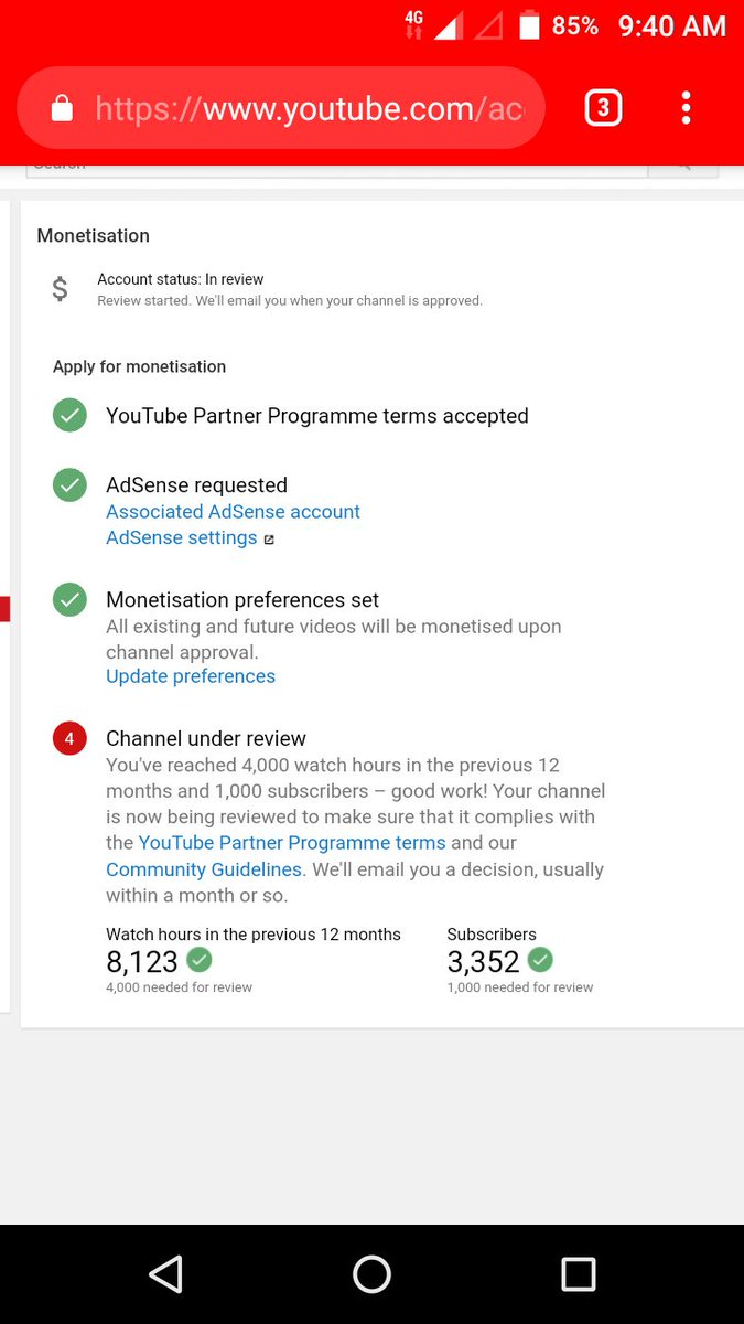 @teamYouTube I have 4000 hours watch time and 1000 subscriber on my channel in last 365 days but monitisation of my channel is not enabled yet.I kindly request to enable my channels monetization as soon as possible My channel ID :- UC_Ol7icpU7PKuw2f7Knwwog Regards, Debraj Biswaspic.twitter.com/u0ZvcXD02V
