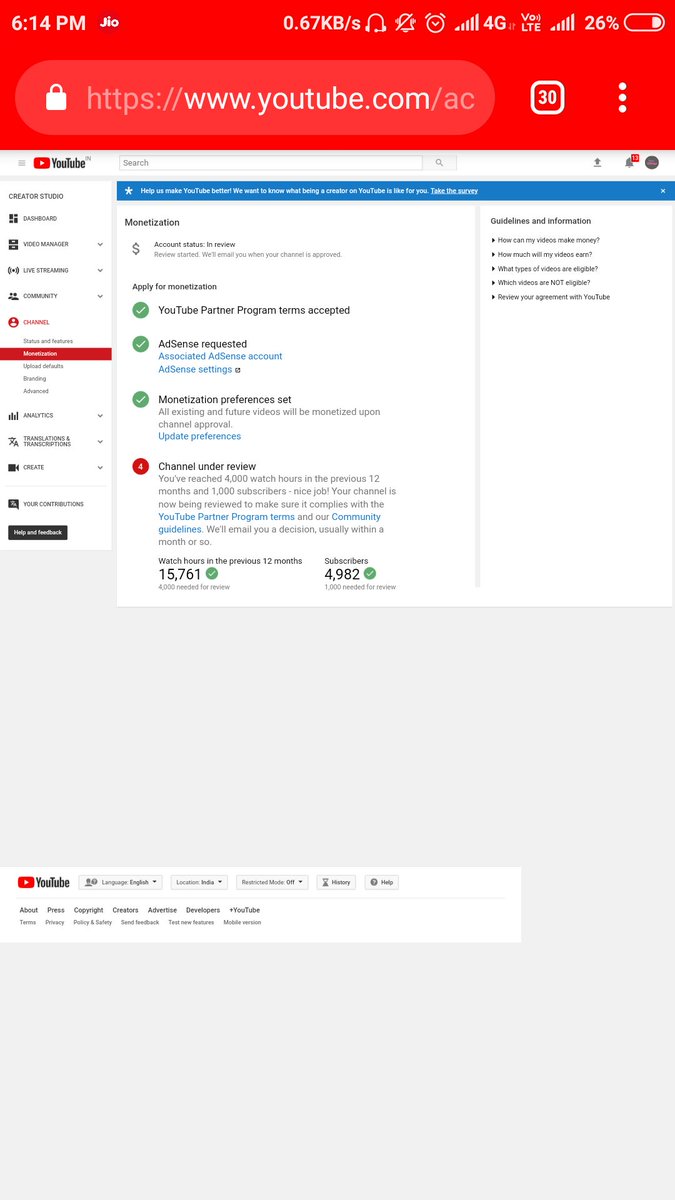 @TeamYouTube Dear team YouTube I have Already Completed 4k Hours And 1k Subscriber In Previous 365 Days And My Channel Is Under Review Till a week ago. But Monetization Is Not Eneble Please Guide Us.. My Channel URL :: https://www.youtube.com/channel/UCPAZgqMZgapnI0odZ2WlrnA …pic.twitter.com/6QTPAWMQZT