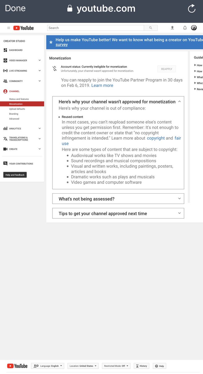 @TeamYouTube Hello, could you please be more specific in what exactly makes my channel ineligible? If I could get proper feedback then I’m sure I could make adjustments. Please respond. You have my email address on file.