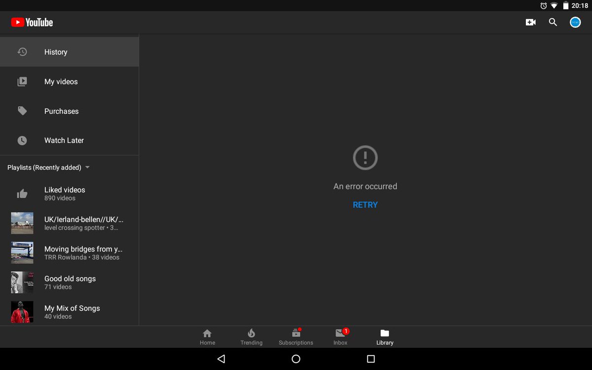 Hi @TeamYouTube I'm having a couple of problems with the app on my tablet. When I click on the 'library' tab I am unable to view my watch history. Also when I click on 'my videos' it firstly doesn't load, then it only shows videos I've made public and not any private onespic.twitter.com/NCts4FkDfB