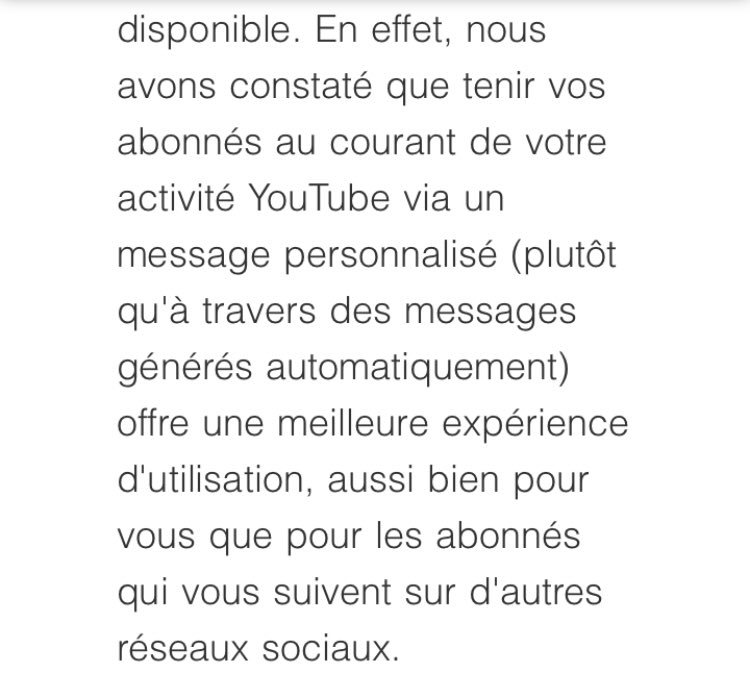Bonjour on pouvais déjà mettre un message personnalisé automatique depuis YouTube qui sortait en même temps que la vidéo. Pourquoi retirer cette option @YTCreateurs je ne comprends pas votre raison ?pic.twitter.com/aumKteMat8