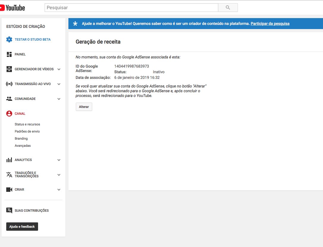 Olá novamente. Apenas para confirmar, a nova conta no Google AdSense não está ativada ainda? Quando você fez a solicitação? Poderia nos enviar a URL do canal para analisarmos melhor? Aguardamos aqui.