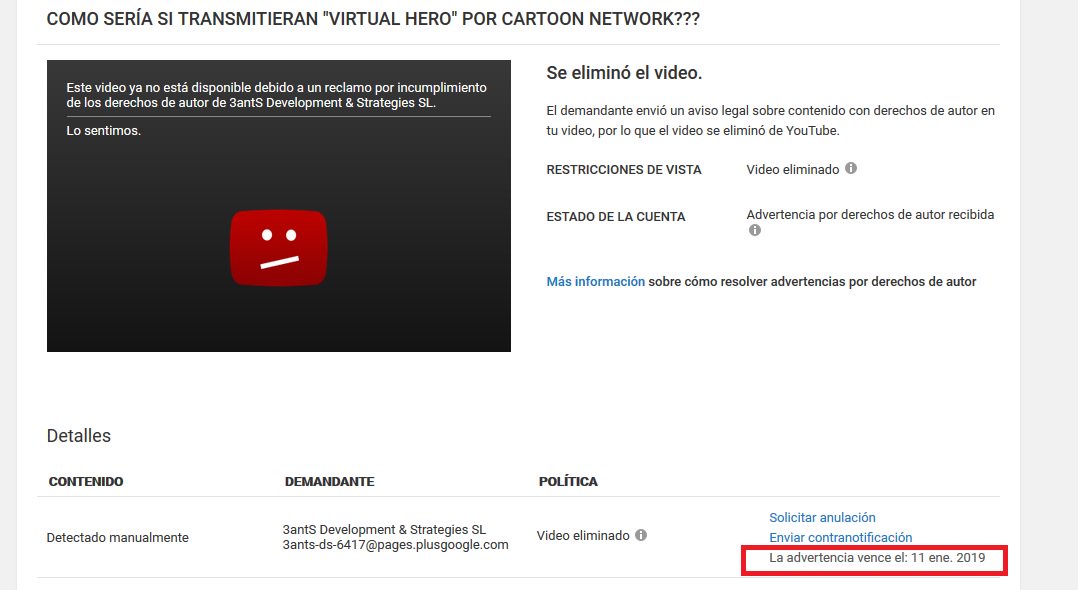 es que la compañía mencionada en el strike (3antS Development & Strategies SL.) me bajó el video por editar un episodio de virtual hero (serie de movistar+ y @rubiu5) tiene modificaciones, es un video parodiando, no quize infringir el copyright, aun por las canciones que tienen
