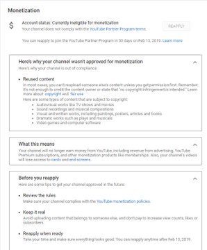 If your channel is out of compliance due to duplication/reused content, this means that the content is not original/is auto-generated. More info: https://goo.gl/E5dgGo . You can make any changes based on those details & always reapply after 30 days.