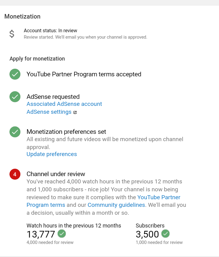 I have completed your given target of 1k subscribers and 4k hours watch time.However my channel monetiza tion is not enable.please review my channel and turn on my Channel link is givenhttps://www.youtube.com/channel/UCyX3enKC29U1qG6hxudO1UQ …