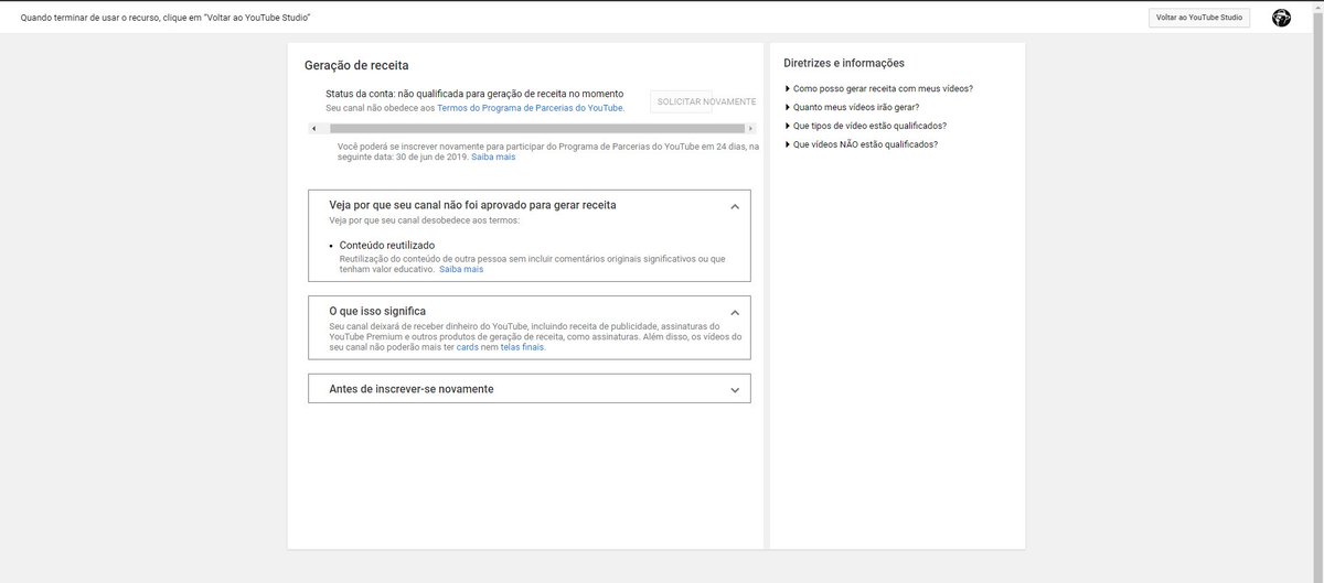 Poderia nos enviar uma captura de tela da sua guia monetização e do motivo pelo qual foi suspenso do Programa de Parcerias do YouTube?