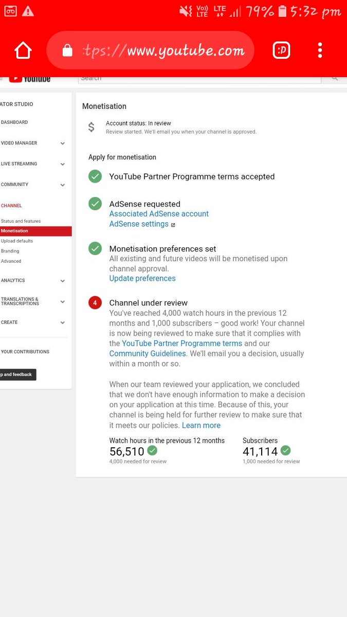 My channel is completed 1k subscribers and 4k watch hours in previous 365 days but my channel is still under review. Please help me