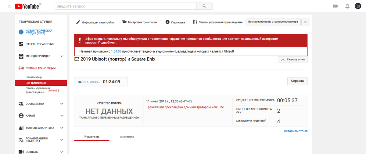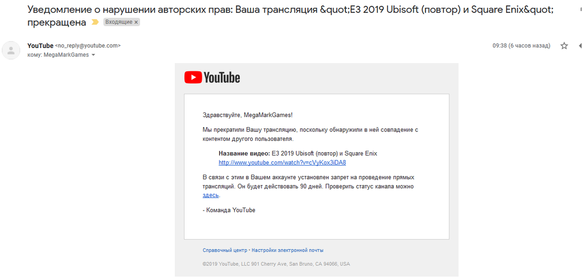 @TeamYouTube сегодня я проводил прямую трансляцию конференции @Ubisoft и моя трансляция была остановлена. На почту мне пришло сообщение что я нарушил авторские права , хотя я их не нарушал. На самой записи стрима нет нарушений авторский прав от Ubisoft. Помогите пожалуйста.pic.twitter.com/DOMp6QxbEC
